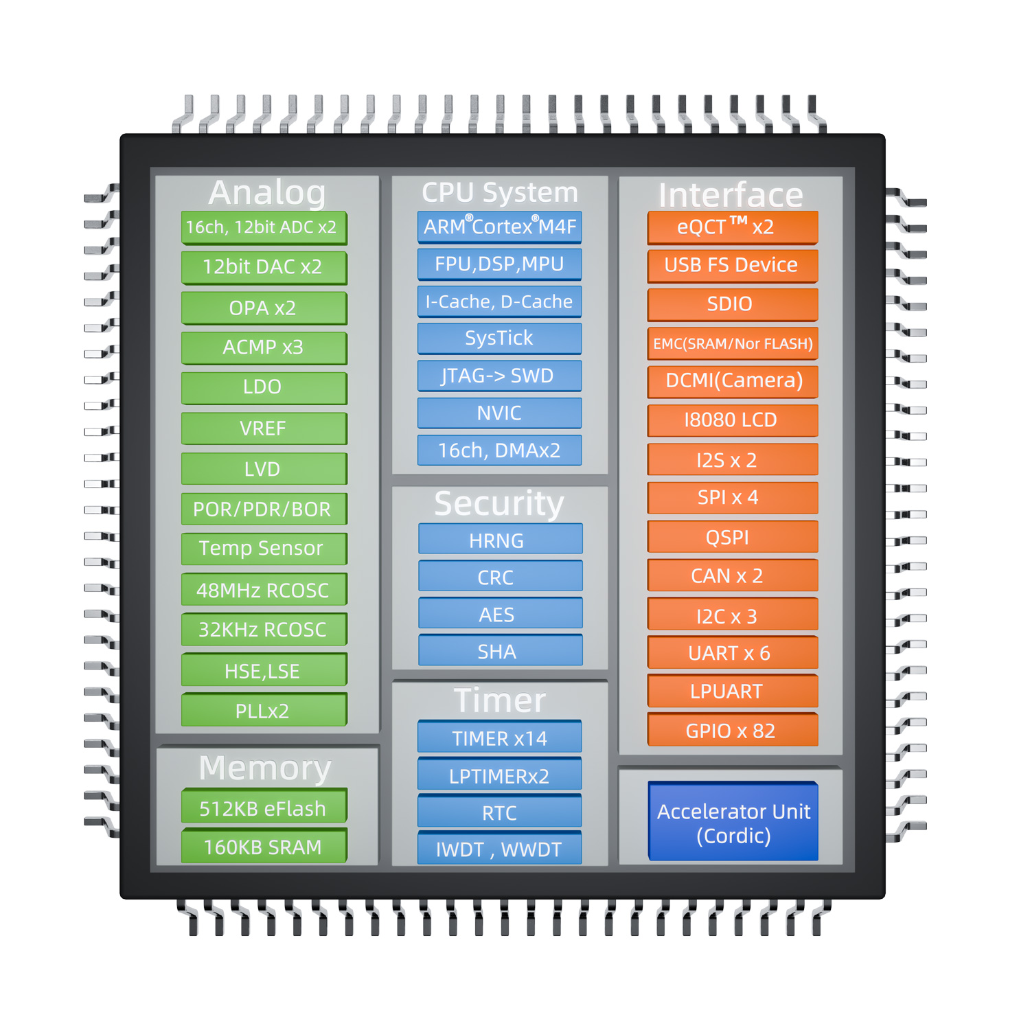 · 2個eQCT?多功能定時器,支持輸入捕獲、可編程死區插入的三相PWM互補輸出、正交編碼器和霍爾采集接口的32位高級定時器可用于矢量控制,生成各類電機的控制信號