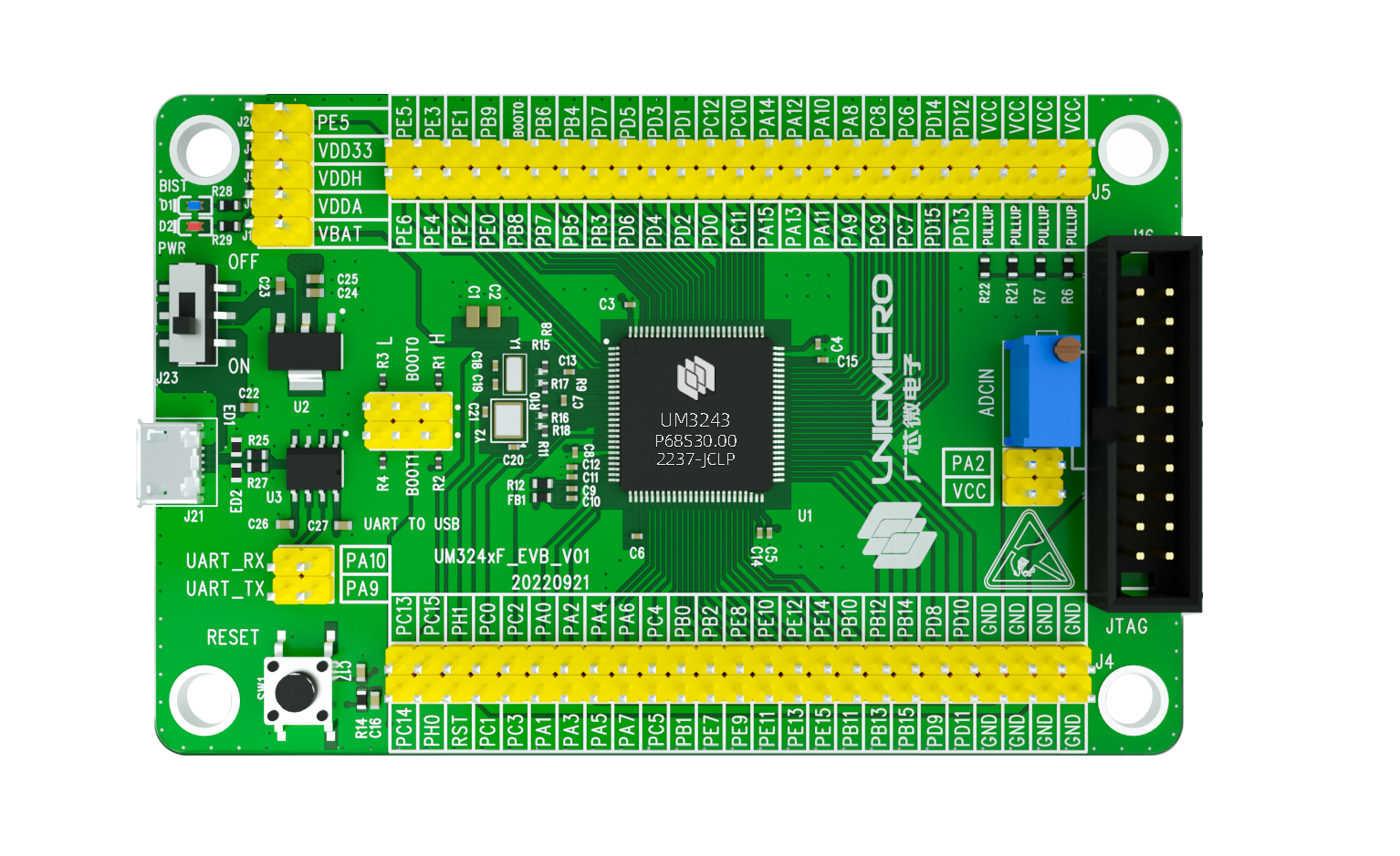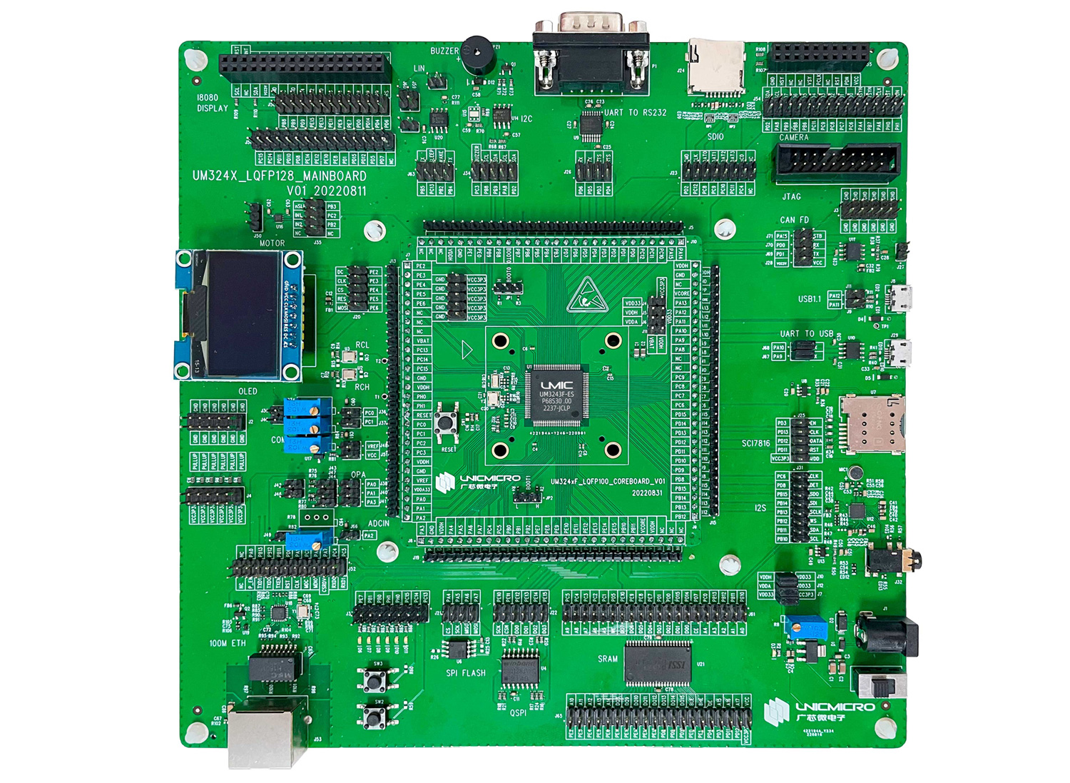 UM324xF Evaluation Board是基于ARM? Cortex? -M4F內核架構的處理器芯片的全功能系統評估板,適合基于UM324xF系列高性能、低功耗等應用場景進行全功能應用原型驗證和評估。Evaluation Board硬件上有JTAG/SWD、UART Debug調試接口,DCMI、I80、I2S音視頻顯示人接交互接口,集成多路GPIO/UART/I2C/LIN /SPI /QSPI/ CAN /SDIO常用外設,SRAM/XRAM/NOR FLASH靈活內外部存儲。軟件上廣芯微提供全部板載外設驅動程序,樣列工程等開發套件,以及詳盡的用戶手冊,數據手冊,應用筆記等文檔資料,滿足高性能系統的開發需求。