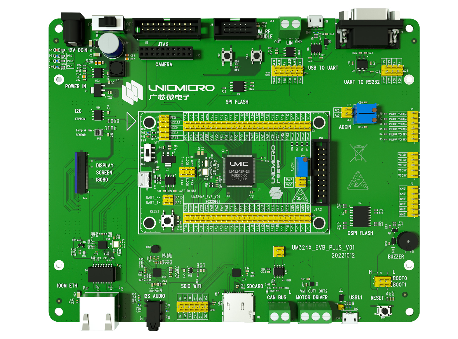 UM324xF Evaluation Board Plus 是基于ARM? Cortex? -M4F內核架構的高性能、低功耗系列芯片發布的全功能系統評估板。為客戶提供更全面的開發評估體驗,包括GPIO/UART/I2C/LIN /SPI /QSPI/I2S/ADC/DAC/I80/DCMI/CAN/SDIO等常用接口,并且板載帶有評估用的常用外圍器件,如支持RJ45接口、USB2.0 FS Device、TF卡、并口SRAM和NOR FLASH、QSPI FLASH、音頻MIC、TFT LCD彩屏、攝像頭、電位器、揚聲器、LED燈、用戶按鍵等。廣芯微提供全部板載外設驅動程序、樣例工程等開發套件,以及詳盡的用戶手冊、數據手冊、應用筆記等文檔資料,滿足高性能系統的開發需求。